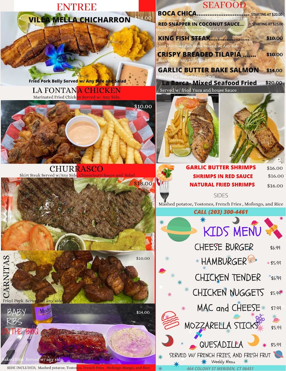 ALL ORDERS COME WITH A SIDE SIDES: rice, mashed potato, mangu, tostones, maduros, french fries, yuca, salad,